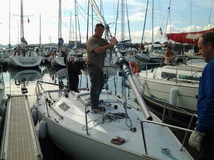 La promo de CQP maintenance nautique a procédé à la dernière étape du refit de Mazurka, l'un des trois Class8 de l'INB. Intégralement réaccastillé à neuf grâce au partenariat avec Seldén, et tout juste remis à l'eau, le bateau a reçu son mât.