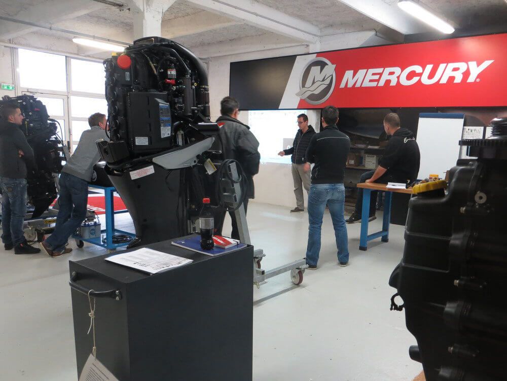 Pour leur session biennale de formation avec le constructeur, les pros du réseau Mercury ouvrent les portes de leur plateau technique aux stagiaires CQP Mécanicien nautique.
