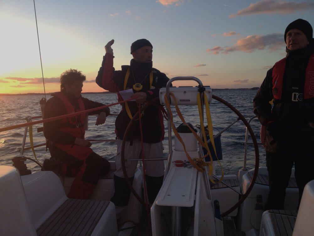 L'examen final a lieu cette semaine. Un examen primordial puisque il compte à lui seul pour un tiers de la note finale du module. Les futurs skippers sont jugés sur une navigation nocturne et en solo de 4h qu'ils réalisent sur habitable. C'est le site de Quiberon qui a été retenu, car il offre un plan d'eau à la fois protégé et riche en amers remarquables et en courants. La navigation se faisant de nuit, les candidats doivent faire preuve d'une solide maîtrise des tenue de cap et des relevés de position.